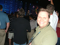 and plopped us at a table near the front of the stage. While waiting for Hootie and the Blowfish to take the stage, Randy finds a new friend from the Cirque de Solei type characters meandering around the flocks of people...